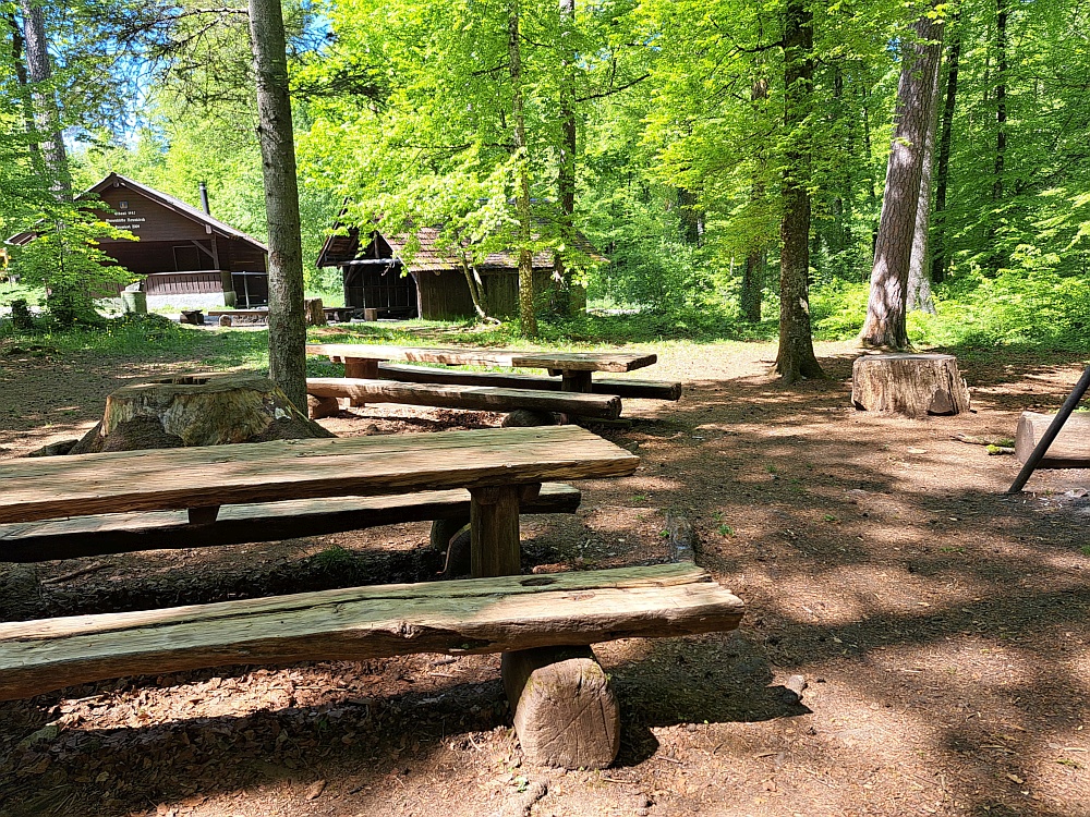 Nach der Einkehr folgen wir den gelben Pfeilen zur Wasenhütte, einer gedeckten Picknickhütte mit Grillstelle und mehreren Sitzbänken unter den Bäumen.