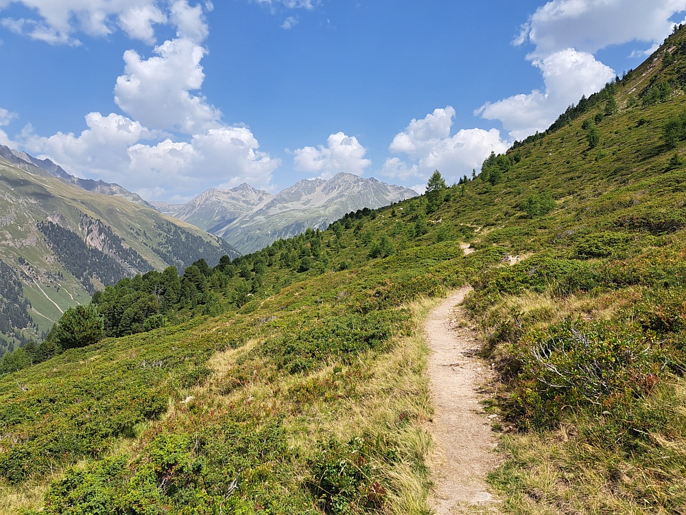 (Heidelbeeren!) und an Einzelbäumen wie Bergföhren und Arven vorbei zur