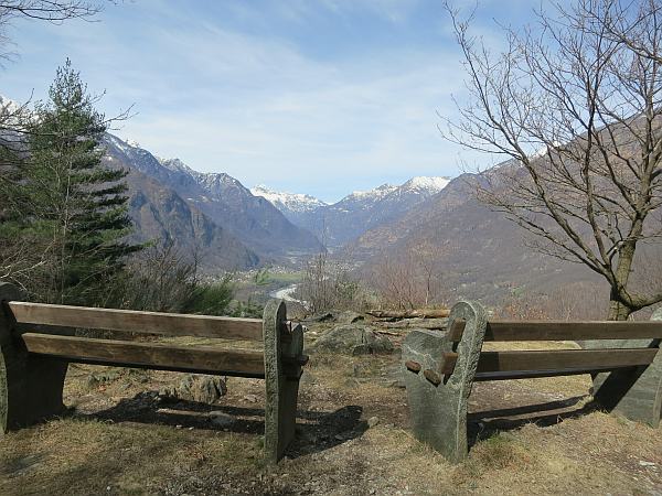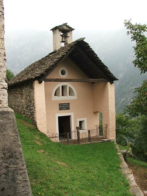 Dorf Avegno. Beim Ruhebänklein nach der Passhöhe Forcola