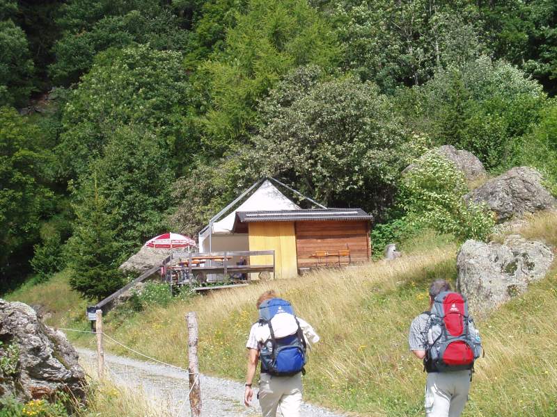 Weiter hinauf führt der Weg, durch lichten Tannen- und Laubwald hindurch, bis ein Plateau erreicht ist, das den Blick auf den Talgrund freigibt, auf die Steindächer von Vicosoprano, dem ehemaligen Hauptort des Bergells. An dieser Stelle ist in der Felswand des Berghangs eine Eisentür zu erkennen. Es handelt sich hierbei um ein Stollenfenster, das beim Bau des Druckstollens von Casaccia nach Castasegna als Materiallager diente. Mit diesen visuellen Eindrücken im Kopf gehts weiter, durch dichten und schattenspendenden Fichtenwald Richtung Durbegia, dem vielleicht schönsten Aussichtspunkt dieser Wanderung. Nachdem fast die Hälfte der Strecke zurückgelegt wurde, empfiehlt es sich, auf dieser Maiensäss eine längere Rast oder Picknickpause einzulegen. Wer sich nicht aus dem Rucksack verpflegt, kann auf das Angebot eines Wanderkiosks zurückgreifen, übrigens die einzige Restaurationsmöglichkeit auf der ganzen Strecke.
