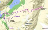 Die kurze Strecke von der Alp Grüm zum Hotel Belvédère hinauf ist die steilste des Tages. Das Gasthaus ist von Poschiavo aus zu sehen und bietet eine grandiose Sicht ins Puschlav und zum Gletscher. Bequemer Höhenweg dem Hang entlang zur Verzweigung Pozzo del Dagro (von wo man in je 20 Minuten zum kleinen See Lagh de l'Ombra absteigen oder nach Sassal Masone aufsteigen könnte). Wir aber halten die Richtung und wandern auf steinigem Weg leicht bergauf Richtung "Ospizio Bernina". Kurz vor dem Staudamm teilen sich die Wege erneut: