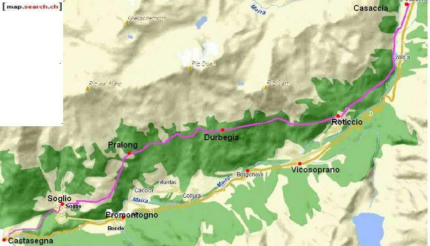 Castasegna 686m - Borgonuovo - Prosto 382m - Chiavenna 333m (4h), aufwärts 480m, abwärts 830m