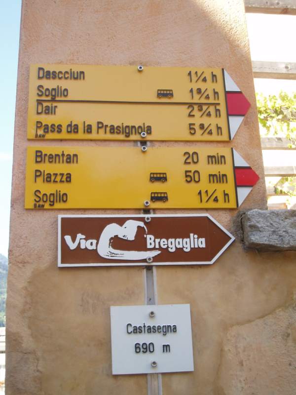 Am unteren Dorfrand von Castasegna, 150m nach dem alten Zoll, beginnt links der gelb markierte Wanderweg nach Chiavenna, der "Percorso storico". Er führt dem Bach entlang, durch Auen- und Kastanienwald, talabwärts. Die Abzweigung rechts nach dem Staubecken ignorieren! Unsere Route überquert eine moderne Brücke, wo sie in einem Bogen nach Chete aufsteigt. Wir befinden uns nun auf der linken Talseite, kommen am Weiler Canete vorbei und wandern durch Wiesen und lichten Wald. Nach dem Weiler Giavera gehts wieder auf die rechte Talseite, die Hauptstrasse unterquerend, zu einer Ansammlung von Ställen hinauf. Schöner Abstieg via Brigola (Restaurant) nach Santa Croce. Wiederum wechseln wir die Talseite und wandern auf Quartierstrassen nach Aurogno.Richtung "Borgonuovo" führt ein gepflästerter Weg durch Kastanienwald bergab. Unten lohnt sich ein Abstecher zum Grotto Fuin (Wasserfälle). Weiter an der Kirche Sant'Abbonio vorbei, an gut erhaltenen Trockenmauern vorbei. Unser Weg überquert einen Wildbach und führt beim Albergo Prosto auf die Hauptstrasse. An Kirche, Läden Grotto und dem alten Ospedale von Prosto vorbei, folgen wir weiter den gelben Markierungen, um einen Felsbuckel herum. In der Waldlichtung weiden Schafe und Pferde. Der Weg führt direkt in die Altstadt von Chiavenna auf den grossen Platz vor dem Castello. Eine Besichtung des schönen Städchens lohnt sich.