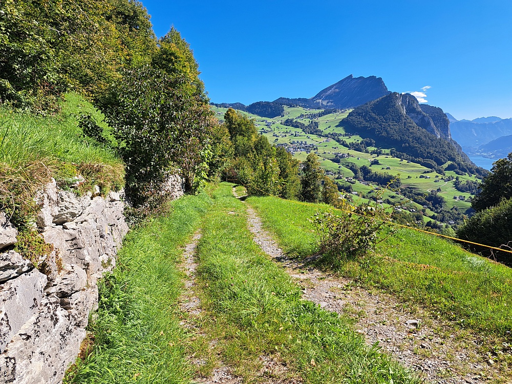 Zurück beim Lindenboden, wandern wir Richtung "Rittersberg". Ein steiles Natursträsschen führt aufwärts; im Wald folgen wir dem Pfad ins Wiesland; schöner Trampelpfad zum Bauernhaus hinauf. Nach links zum Nachbarhof und wieder nach rechts aufwärts mehrheitlich über Wiesenwege zum Eichholzberg. Auf gutem Weg erreichen wir die Hochebene Rittersberg. Schöne Aussicht auf Churfirsten und Walensee! Bei der Holzbeige am Waldrand finden wir einen idealen Platz zum Picknicken.