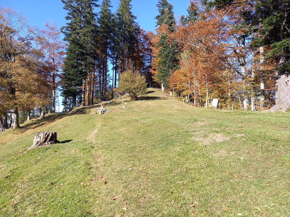 Weiter gehts der Höhenkurve entlang Richtung "Wolfsgrueb". Nach einem kurzen Waldstück steigt der Pfad am sonnigen Waldrand (1250m) empor - ein idealer Platz zum Rasten und Staunen. Von den Glarner Alpen bis zum Säntis ist alles zu sehen. Nun gehts durch den Wald - teilweise etwas nass - zur Wolfsgrueb hinunter; wir befinden uns hier im Tössquellgebiet.
