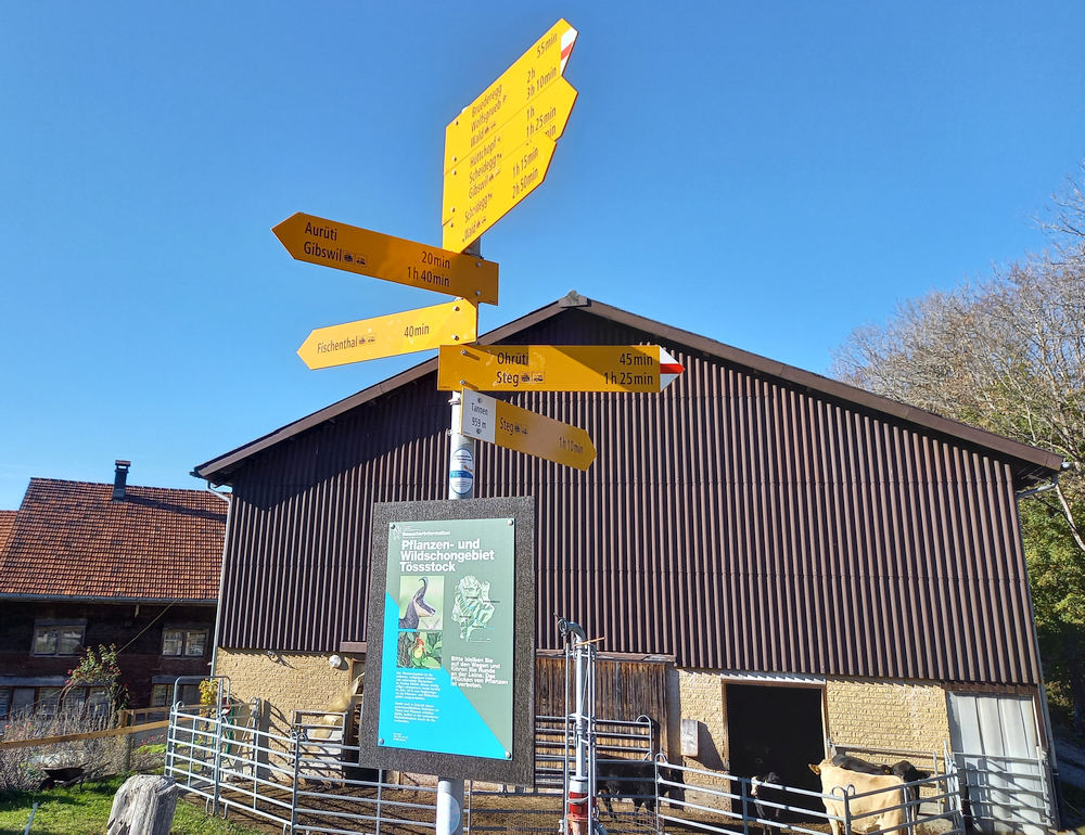 Wir folgen nun den Wegweisern Richtung Fischenthal/Steg. Am Fusse des Hüttchopfs könnten wir links der Höhenkurve entlang gehen. Lohnenswert ist einen Abstecher von 10 Minuten und 70 Höhenmetern zum Gipfelkreuz, wo wir einen herrlichen Rundblick geniessen. Auf der andern Seite des Hüttchopfs treffen die beiden Wege wieder zusammen. Auf sonnigen Wiesen- Wald- und groben Nagelfluh-Wegen hoch über dem Tösswald gelangen wir nach Tannen, wo wir uns (je nach Zug-Abfahrtszeiten) entscheiden müssen: