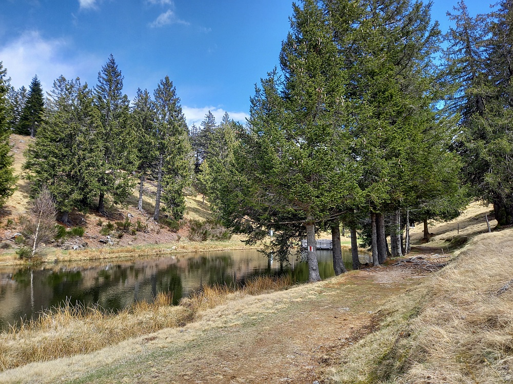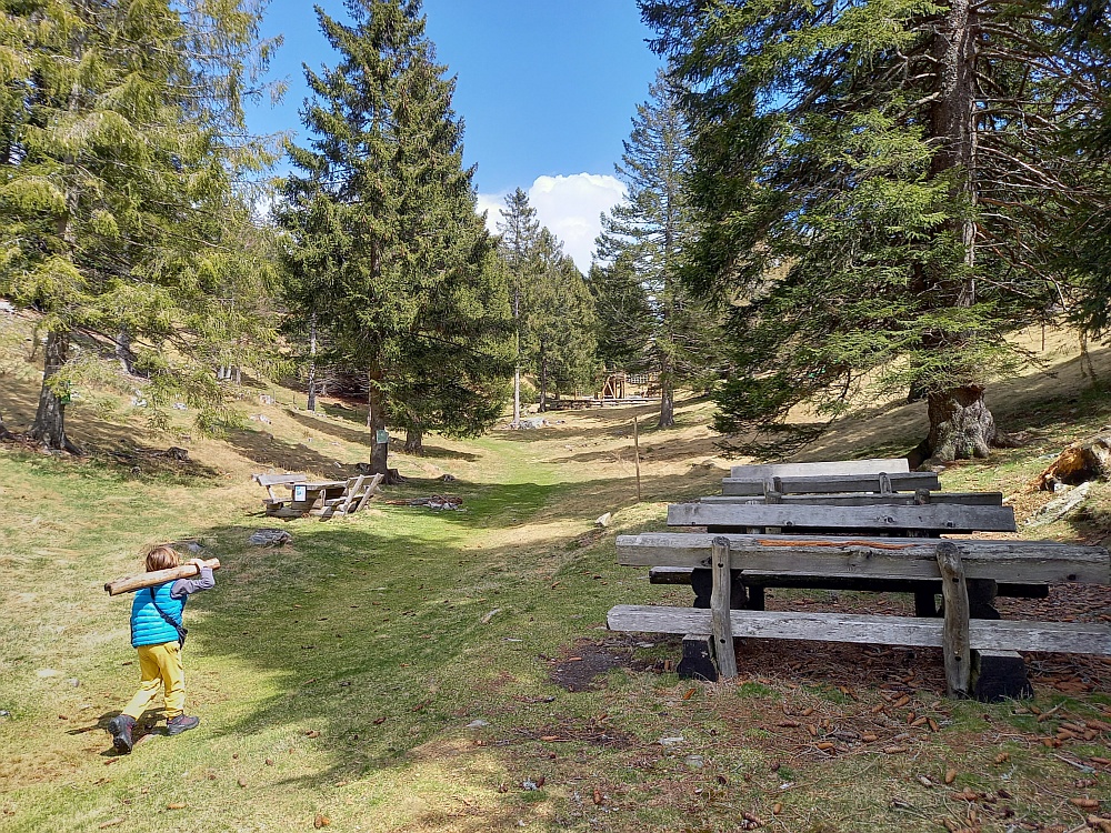 Birkenwäldchen erreichen wir auf ebenem Waldweg die obere Mittelstation Pientina / Pcentina, mit Brunnen, Ruhebank, WC