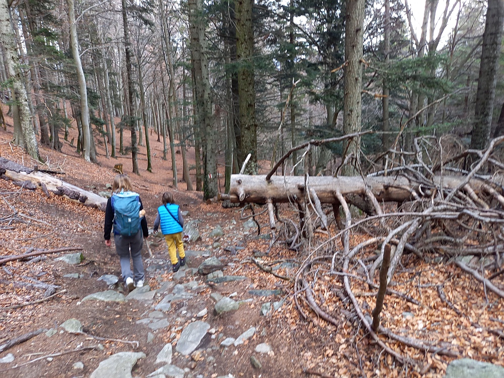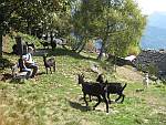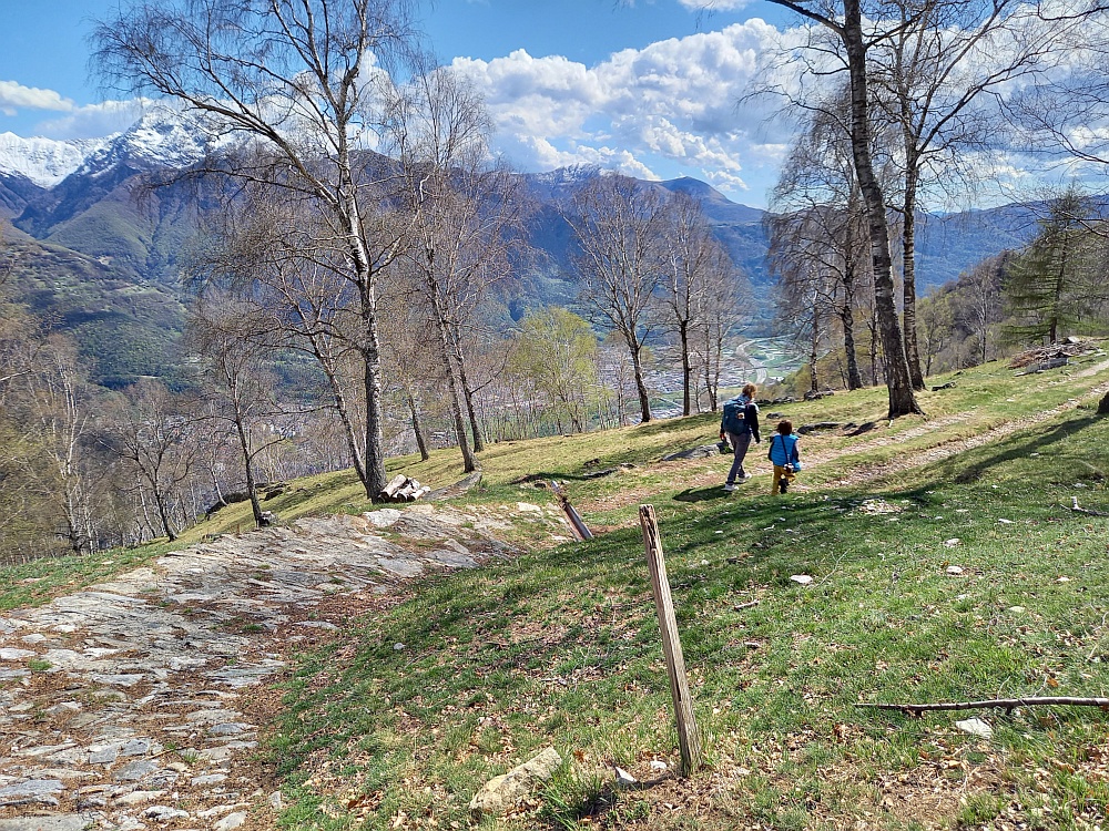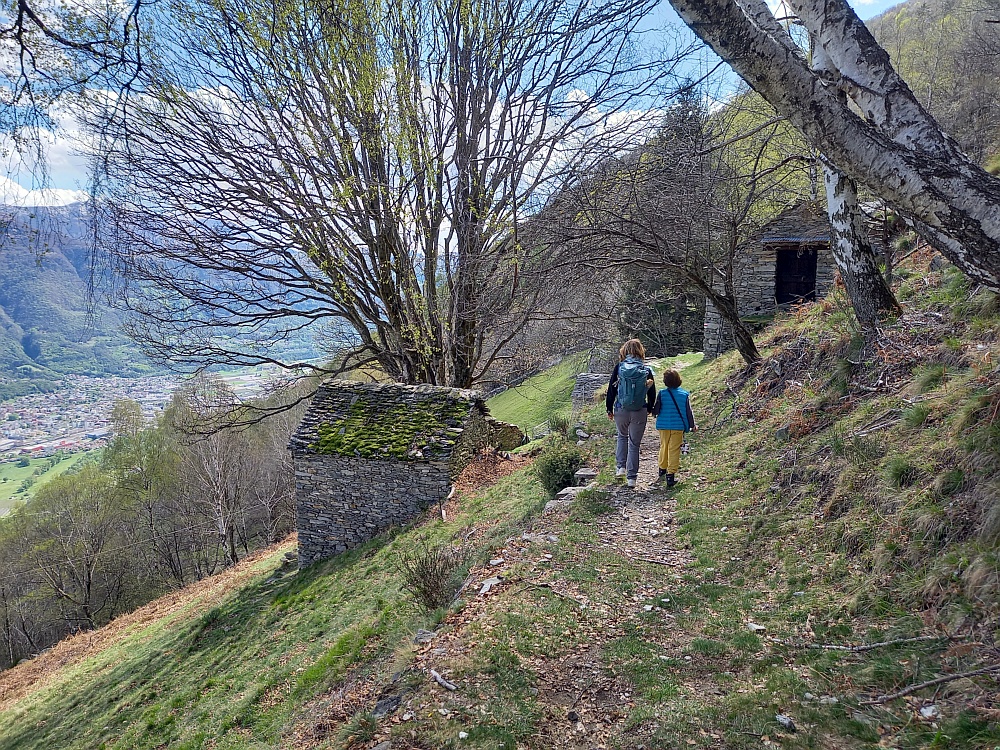 Unser Weg führt kurz ebenaus zur Verzweigung, von wo wir nun aufwärts immer Richtung "Pientina" wandern, auch bei der nächsten Verzweigung (möglicher Abstecher zur Hängebrücke "Ponte Tibetano", siehe Wanderung 460b). Ein teils ruppiger Weg mit vielen Steintreppen leitet durch den dichten Kastanienwald von Ruscada zur Alp Pié Moretti, das in einer schönen Waldlichtung liegt. Unterwegs kreuzen wir eine Kuhherde im Alpabzug, für die der Alpsommer vorbei ist - sie sind berggewohnt und schaffen die steinigen Wege ohne Mühe. In der Waldlichtung auf der Alp wählen wir den mittleren Pfad durchs Farn, doch alle drei Wege treffen oben wieder zusammen.