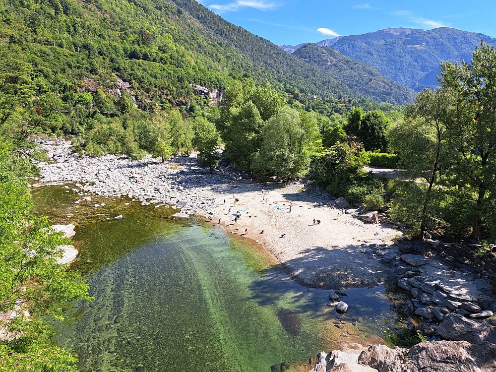 Blick talabwärts und zum Badestrand von Golino unterhalb der Brücke. Wer einkehren möchte, findet direkt über dem kleinen Strand die lauschige Pergola des Hotels Al Ponte Antico von Golino.