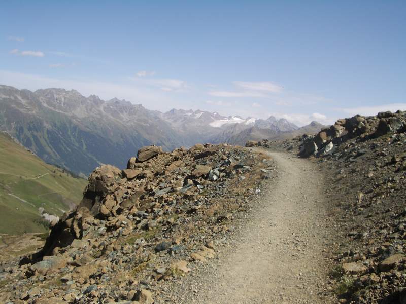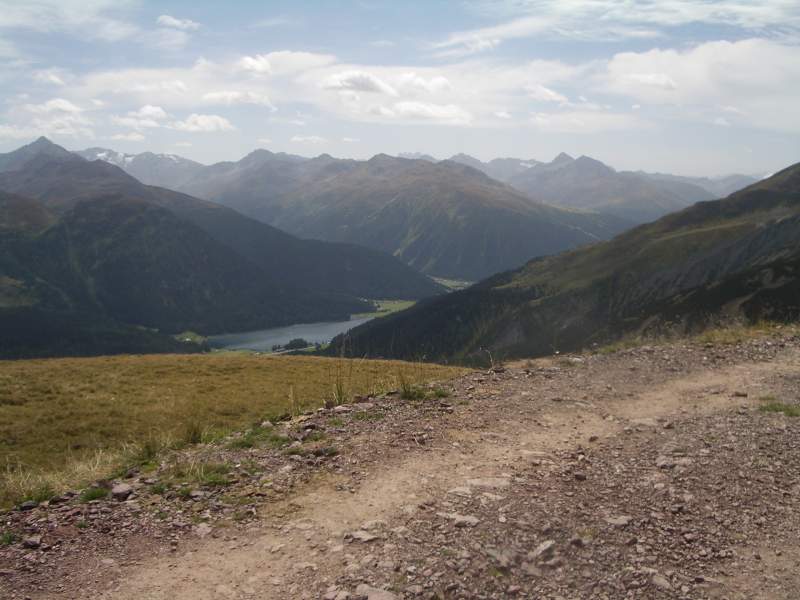 Leicht abwärts gehts ins Meierhofer Tälli, einer einsamen Mondlandschaft voller Geröll. Abstiegsmöglichkeit zum Davorsersee; oben thront das Weissfluhjoch. Wir wandern weiter auf dem Panoramaweg Richtung "Stat. Höhenweg". Er quert einen steilen Schattenhang und führt aufwärts zu einem grandiosen Aussichtspunkt. Nebenan gibt es eine kleine Schutzhütte, ideal bei windigem Wetter.