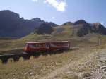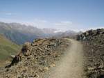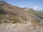 Zunächst dem breiten Weg folgend, steigen wir leicht bergan. Nach der Brücke zweigt unser Höhenweg scharf links ab und führt leicht ansteigend um den Totalp-Hang herum. Hier scheint nichts zu wachsen, alles ist voller Geröll und Felsbrocken in den verschiedensten Farben. Dazwischen entdecken wir schöne Bergblumen. Die Aussicht Richtung Flüelapass, ins Dischmatal und auf den Scalettagletscher ist traumhaft.