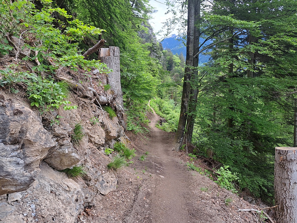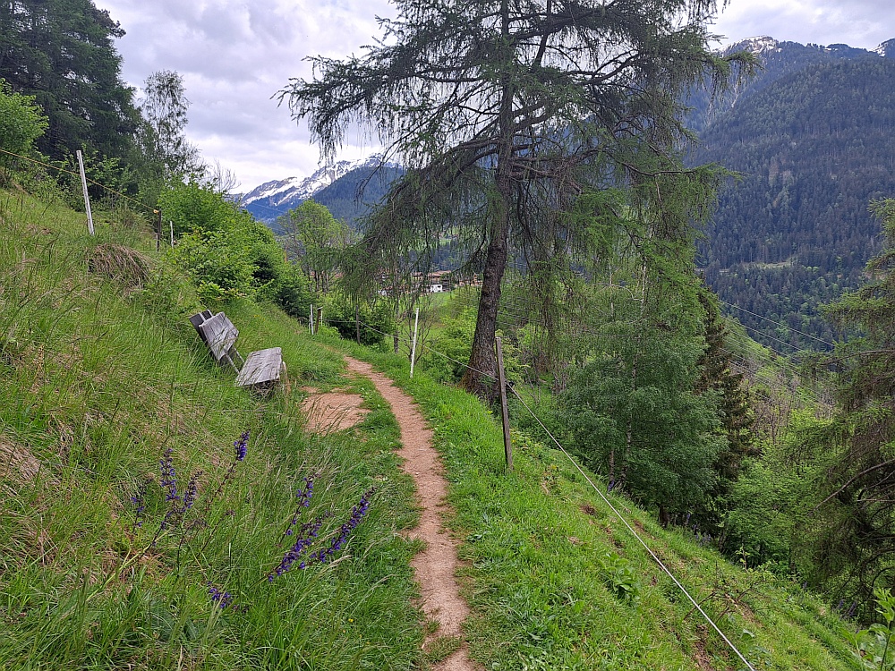 Nach kurzem steilen Abstieg wandern wir mehr oder weniger parallel zur Fahrstrasse Richtung "Hof". Der schmale Weg im feuchten,