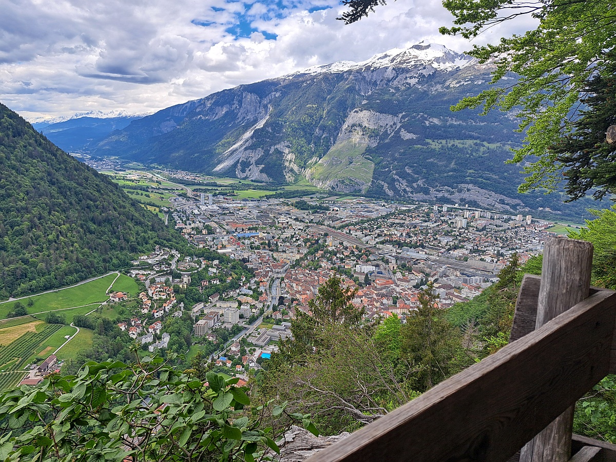 (Ruhebank und kleine Grillstelle). Die Sicht auf die Stadt Chur direkt