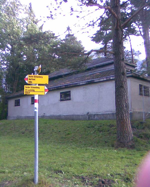 Von dort führt ein sanft abfallendes Natursträsschen dem Waldhang entlang; beim Wegweiser unterhalb der Alp Hinter Ochsenberg zeigte dann ein Pfeil aufwärts (hier wäre man heruntergekommen). Weiter dem Hang entlang, an einem lauschigen, eingezäunten Weiher vorbei. Nun folgt ein längeres Stück im Wald, meist leicht abwärts auf dem Natursträsschen. Bei der Oberen Mattheid kommen wir aus dem Wald; nie nächsten fünf Minuten gehts auf Hartbelag zum Wegweiser Mattheid hinunter. "Neuwald/Fläsch" ist unser neues Ziel.
