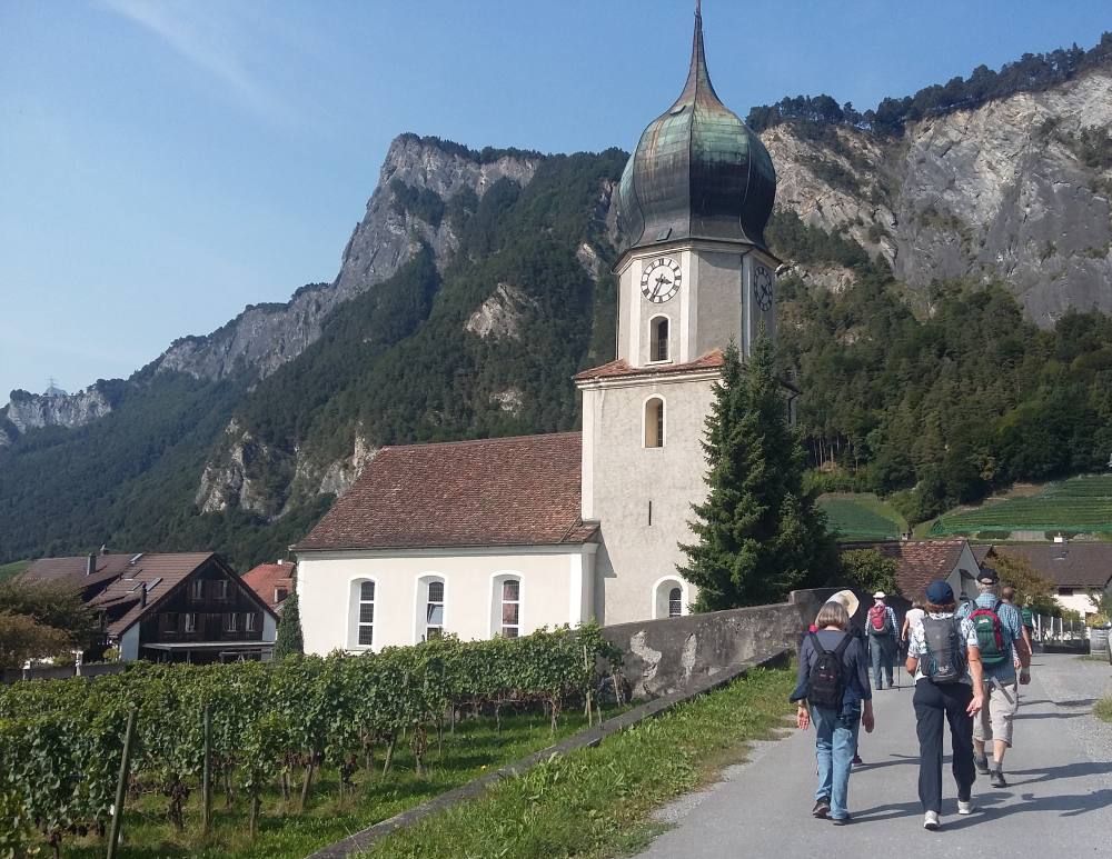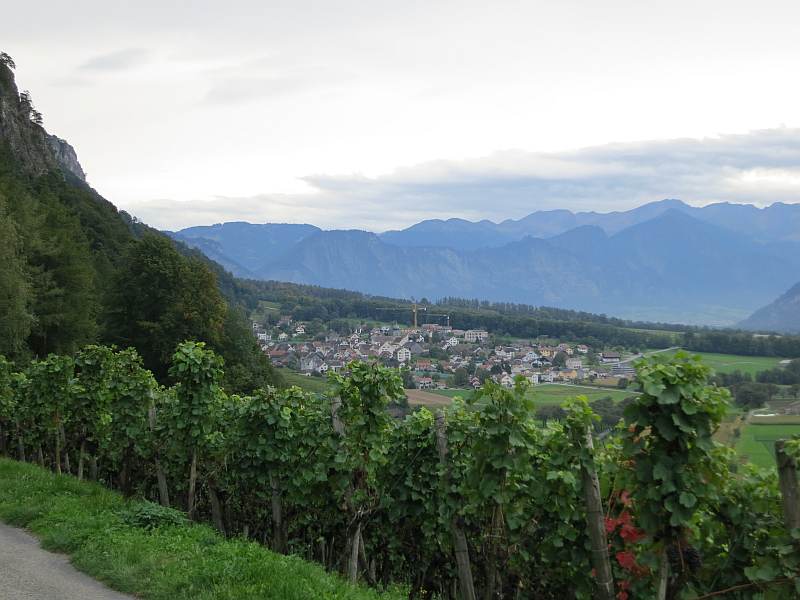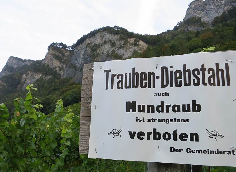 Die letzten 20 Minuten verlaufen auf Hartbelag durch die Rebberge von Fläsch. Direkt über unseren Köpfen thront der Regitzer Spitz, vorne liegt Fläsch, unser Ziel. Schade, dass keine Trauben in Selbstbedienung angeboten werden, das würden wir jetzt sehr schätzen. Wo der rechtsseitige Rebberg endet, gehen wir ins Dorf hinein, drehen beim Brunnen nach links und erreichen in Kürze den Wegweiser, wo wir heute morgen abgezweigt sind. Die Postautohaltestelle Fläsch Post befindet sich 20m rechts, etwas versteckt in einer Nische.