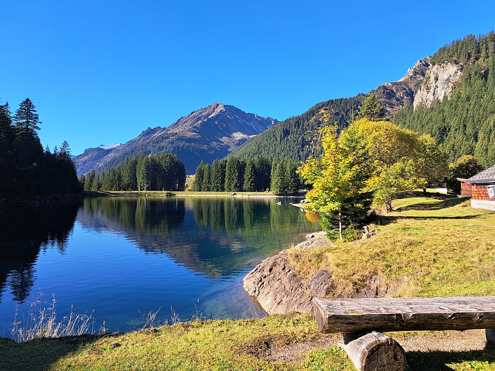 Von der Seilbahn-Bergstation gehts am Berggausthaus Alpenblick vorbei zum idyllischen Arnisee (WC-Anlage mit Rollstuhl-WC). Der Wegweiser zeigt nach rechts dem Ufer entlang zum Materialseilbähnchen, wo der direkte Aufstieg durch den schattigen Grüenwald beginnt. Auf Bergpfaden gehts kurvenreich und recht steil bergauf. Seit den letzten heftigen Gewittern sind die Wege teils ausgewaschen und (vor allem beim Abstieg) mühsam zu gehen; Wurzeln liegen frei, auch sind die Markierungen ziemlich ausgebleicht. Ab und zu erhaschen wir einen Tiefblick auf den idyllischen Arnisee und ins Fellital.