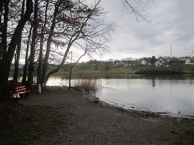 Nun folgt das einzige Wegstück mit Naturbelag (15 Min.); durch den Wald erreichen wir das Chlausplätzli am Rand des Horgenbergs. Bis zum Bergweiher kann der Trampelpfad links vom Teersträsschen benützt werden. Wir queren das Strässchen und finden am sonnigen Waldrand, mit Blick auf den Weiher, einen grosszügigen Picknickplatz. Weitere Sitzbänke gibt es direkt am Ufer. An diesem idyllischen Ort lohnt sich eine Pause.