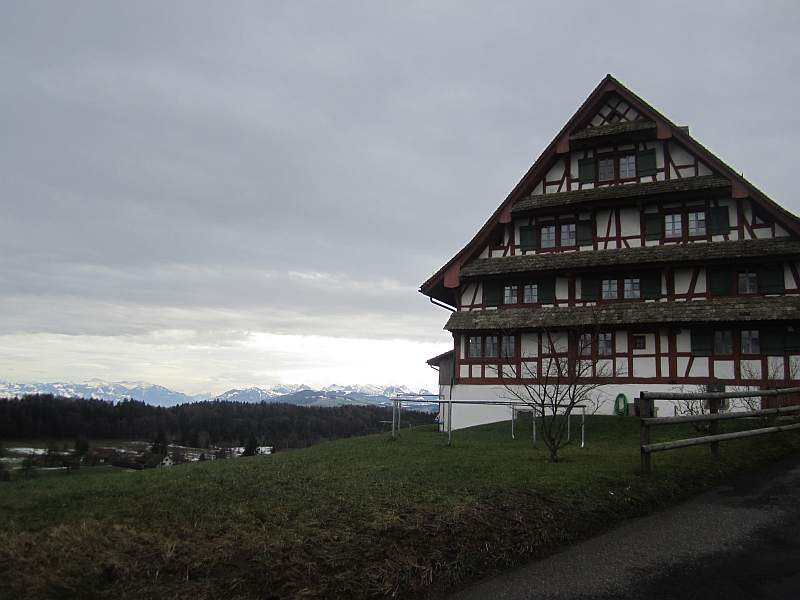Ein letzter Aufstieg führt am stattlichen Riegelhaus Harrhalden vorbei. Oben auf der Hirzel Höhe befindet sich die Wirtschaft zur Höchi, einst wohl ein beliebtes Gasthaus; heute ist es renovationsbedüftig. Hier teilen sich die Wege - der Saumweg folgt nicht dem Wanderweg.