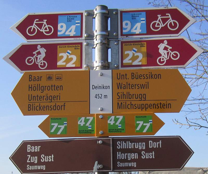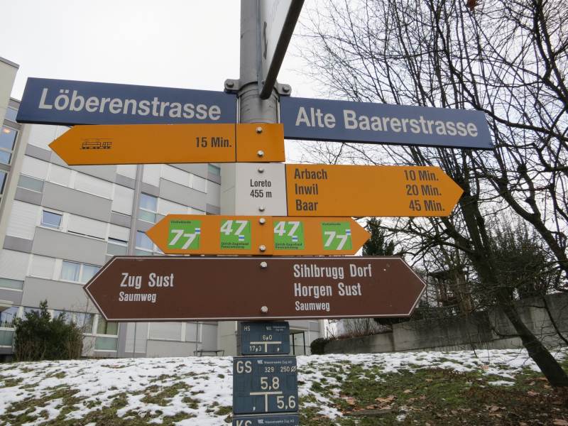Für uns Wanderer gibt es schönere Wege. Wir gehen vom Bahnhof Baar zum Ufer der Lorze und folgen ihm bis nach Unterquerung der Autobahn. Dort teilt sich der Fluss, wir wählen den fussfreundlichen Uferweg der Alten Lorze, auf dem wir bis zur Mündung in den Zugersee wandern können. Der Rest ist schnell beschrieben: Alles dem Seeufer entlang, am Bad und andern Freizeiteinrichtungen vorbei, bis wir den Wegweiser in der Seebucht der Stadt Zug erreicht haben. Zum nahen Bahnhof Zug geht es nach links durch die Alpenstrasse.