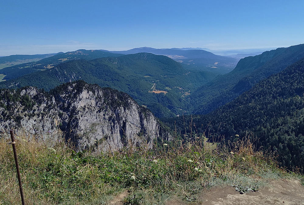 Schneller als man denkt ist man oben auf Krete, wo sich die Szenerie völlig ändert. Ein flaches Feuchtgebiet mit Wiesen voller Trollblumen und Anemonen liegt vor uns, dahinter eine schöne Juraweide. Unser Weg folgt nun dem Kraterrand (Kinder zur Vorsicht mahnen!), mit sensationellen Tief- und Weitblicken. Auf der ganzen Länge gibt es immer wieder schöne Plätschen fürs Picknick. An der höchsten Stelle, beim Wegweiser Le Soliat, bleiben wir am Kraterrand; die Abzweigungen zur "Ferme du Soliat" befinden sich 10 und 15 Minuten weiter unten (das Gasthaus befindet sich 200m links).