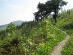 schmaler Hangweg führt durch den schattigen Wald, der im