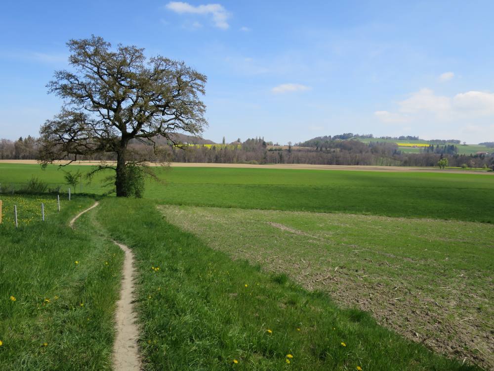 Ab Ameismühle empfängt uns ein liebliches Wiesental. Ein schmaler Pfad folgt weiter dem Bach. Um nach St. Ursen zu kommen, überqueren wir das Gewässer noch einmal und steigen auf grasigem Feldweg zur Kappelle hinauf. Die schöne Kirche des Ortes zieht uns in ihren Bann. Nun weitet sich die Szenerie und gibt den Blick frei auf die Hügelwelt des Senselandes sowie als recht markante Erhebung im Osten das Guggershörnli. Wir durchqueren den Weiler Etiwil und folgen dem Rand eines kleinen Waldes zu den Häusern von Baletswil. Innerhalb eines weiteren Waldes steigen wir steiler an und erhaschen beim folgenden Aussichtspunkt eine wunderbare Sicht auf das Mittelland und den Jura.