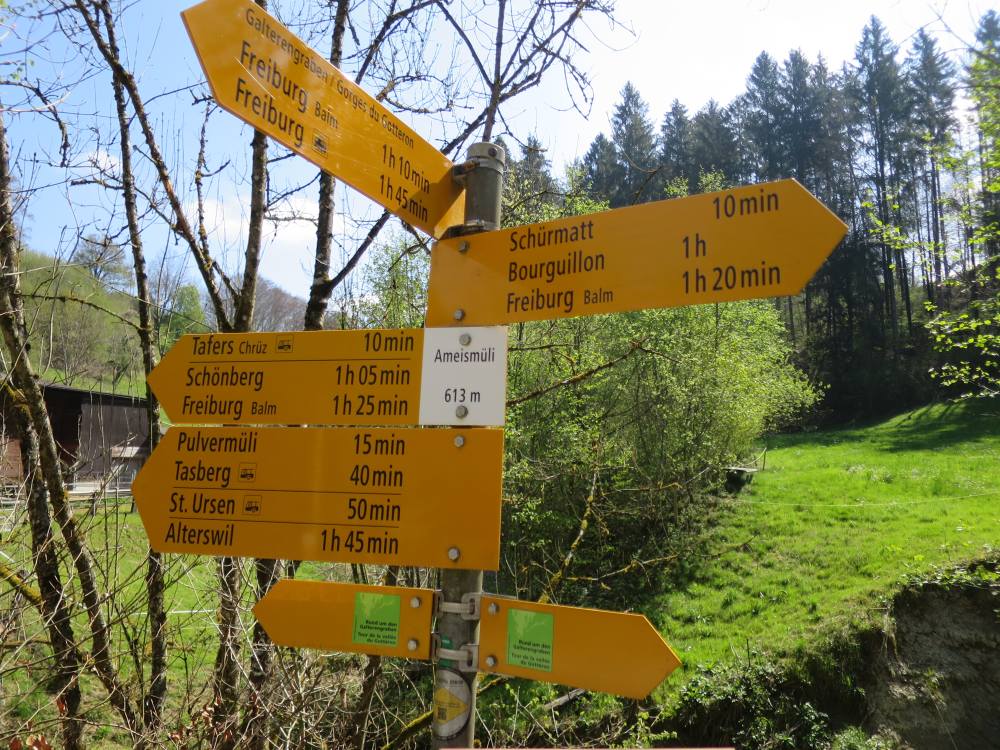 Ameismüli 1h10". Sie zweigt rechts ab, dem Bach Le Gottéron