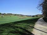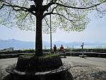 Durch ein letztes Waldstück gehts abwärts zur Bushaltestelle Signal (Bus Nr.16); leicht aufwärts gelangen wir zum Aussichtspunkt Tour de Sauvabelin, von wo man nochmals das ganze Genfersee-Panorama geniessen kann. Am Aussichtsrestaurant "Le Chalet Suisse" vorbei gehts in den Hermitage-Park hinein; es ist ein warmer Frühlingstag, auf der blühenden Wiese wird gespielt und geruht, und nirgends sieht man ein Verbotsschild (ausser Hundeverbot). Der Jakobsweg zweigt links ab und führt zum Kunstmuseum Fondation de l'Hermitage hinunter. Dahinter liegt ein gepflegter, alter Park, auch er wird von den Anwohnern rege genutzt.