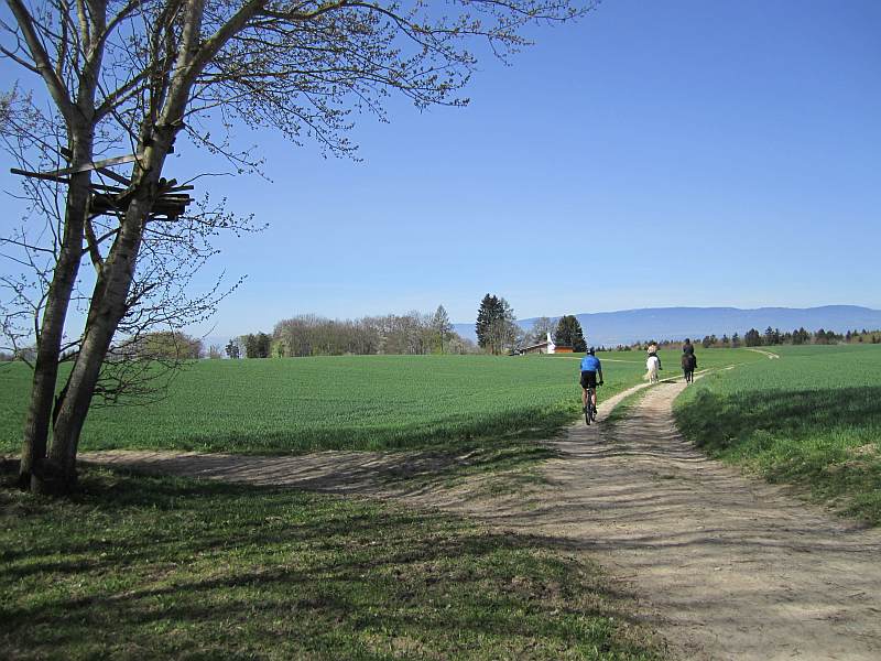 Neben der Haltestelle Chalet-à-Gobet befindet sich zwischen zwei Waldrändern eine weite landwirtschaftliche Fläche, der wir zunächst entlang gehen, und zwar folgen wir dem rechten Waldrand (die sonnige linke Seite ist geteert); den Hauptwegweiser finden am Waldrand wir links vom Parkplatz. Nach 10 Minuten dreht unsere Route links ab; ein weicher Schnitzelpfad quert das Tälchen und trifft auf das Teersträsschen am andern Waldrand. Achtung, der Wald ist durchsetzt von Laufstrecken (Helvetia-Trail, Vita-Parcours, Reitweg) - immer nur den gelben Wegweisern und Rhomben folgen! Das Strässchen kurvt in den Wald hinein, auf eine Wegkreuzung zu (5 Min.).