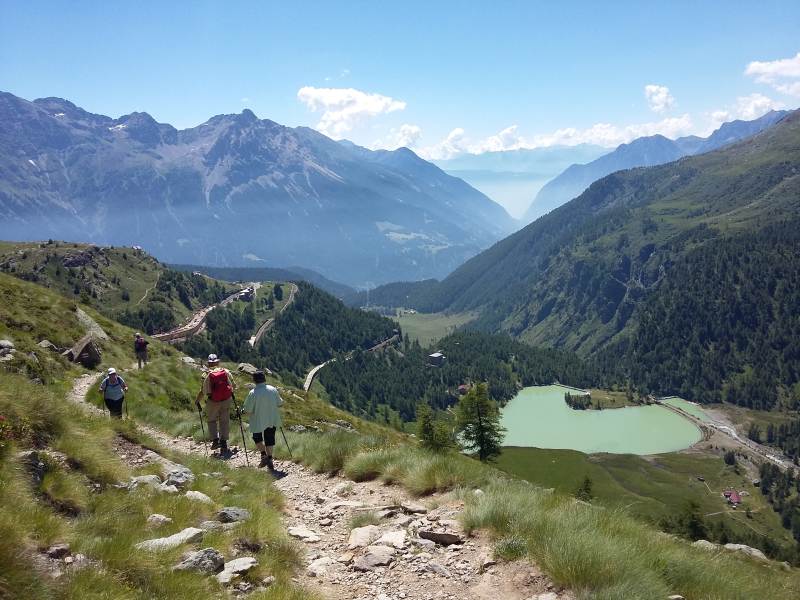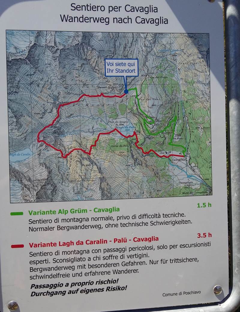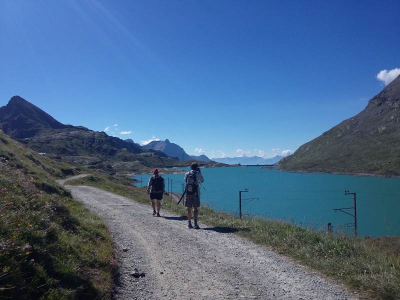 Ab Lagh da Caralin wandern wir zunächst auf dem gleichen Weg zurück, auf welchem wir gekommen sind. Wiederum beeindruckt uns das wunderschöne Alpenpanorama ringsum. Beim Punkt 2127m wählen wir aber den direkten Weg nach Alp Grüm, welche wir nach knapp 1h30 erreichen. Dieser führt uns am Schluss durch die Arvenwälder oberhalb Alp Grüm und endet dann mit einem „Furioso“ beim Bahnhof Alp Grüm: wir sehen hinunter auf den Lai da Palü; rechts sehen wir die Moräne des Gletschers, welcher einmal, vergangen Zeiten, bis zu diesem See reichte. Im Hintergrund grüsst uns der Palügletscher mit dem Tal, welches wir erwandert haben.