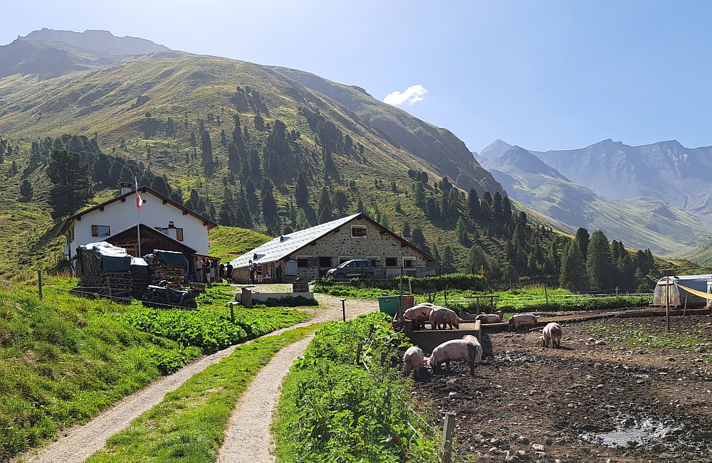 "Darlux Bergstation". Aufstieg im kühlen Wald auf sanft ansteigendem Natursträsschen zur Alp digl Chant. Glückliche Schweine suhlen auf dem Feld, für Wandernde gibt es frische Alpprodukte wie Joghurt und Käse zu kaufen.