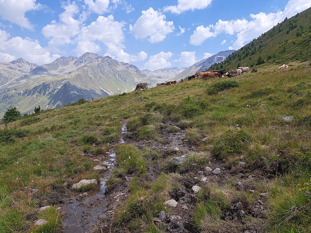 voll zu erwischen. Kurz vor der Alp Muotta Sur gabelt sich der Weg - die Wanderroute verläuft oberhalb der Alphütte und dreht dann links um den Hang herum.