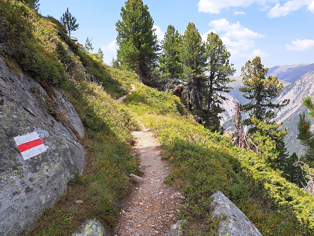 (Heidelbeeren!) und an Einzelbäumen wie Bergföhren und Arven vorbei zur