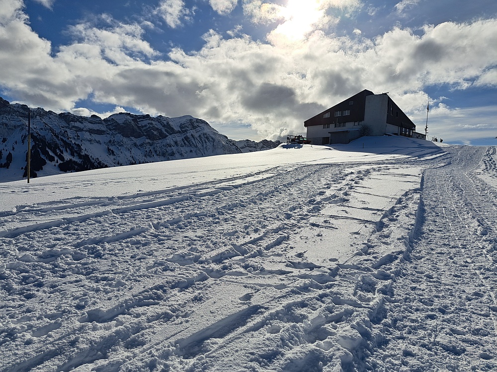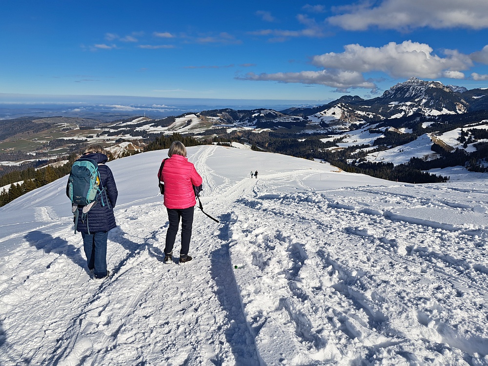 wandern auf griffigem Neuschnee sanft bergauf, an der Neuhütte vorbei zum sonnig gelegenen Alpgebäude Reistegg. Schöner Blick über das Entlebuch!