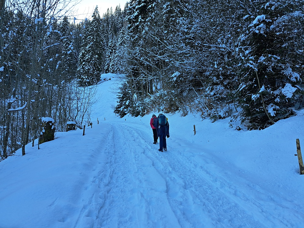 Fahrverbot - vor Eisglätte wird gewarnt. Das Strässchen ist schneebedeckt - zum Glück, denn bis Reistegg wäre es geteert. Wir aber