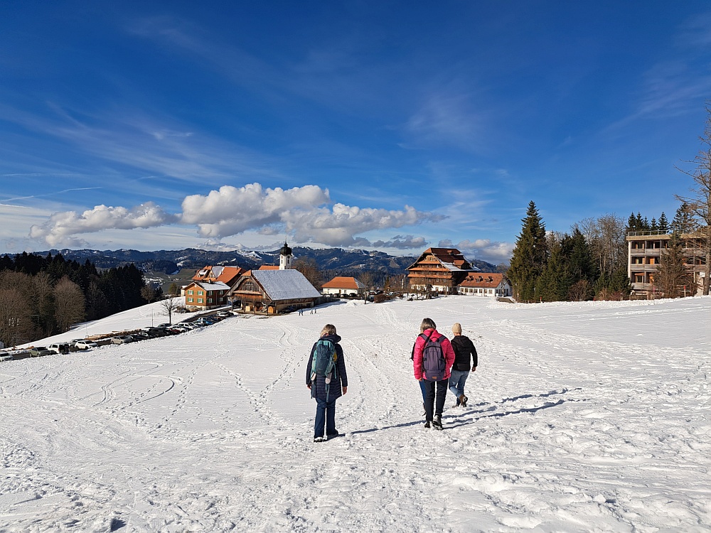 Der Abstieg ist gut markiert; vor dem Restaurant weist unser 605-Pfeil hangabwärts und dreht dann nach rechts. Heute ist der Schnee so griffig, dass wir auch dort, wo es ziemlich steil ist, keine Schuhkrallen brauchen.Vor