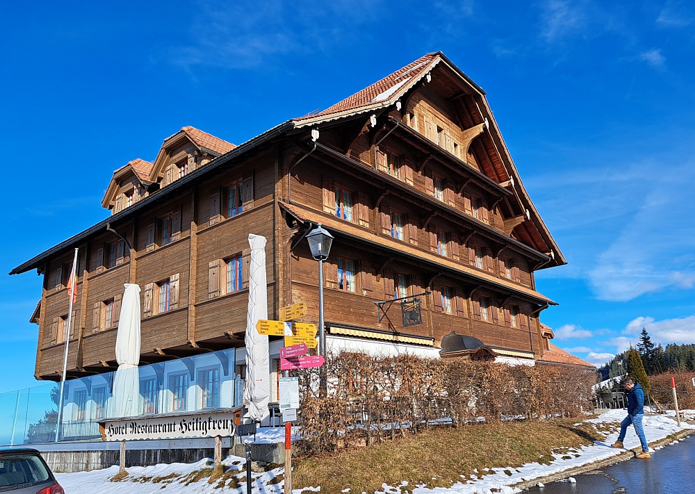 Auf breitem, sonnigen Weg queren wir den Hang zum Dräckloch, überqueren eine Brücke und folgen der Spur steil hangabwärts - hier lohnt sich je nach Schneebeschaffenheit das Überstülpen der Schuhkrallen. Bei einem Waldstück, das wir rechts umwandern, wird der Weg sanfter, wir treffen auf das Strässchen, das vom Romooser Howald herkommt. Im Sonnenhang vergnügen sich schlittelnde Kinder. Wir folgen dem Weg zum Restaurant Heiligkreuz hinunter, wo sich die Runde schliesst. Wer noch Zeit hat, kann einkehren oder die sehenswerte Wallfahrtskirche besichtigen.