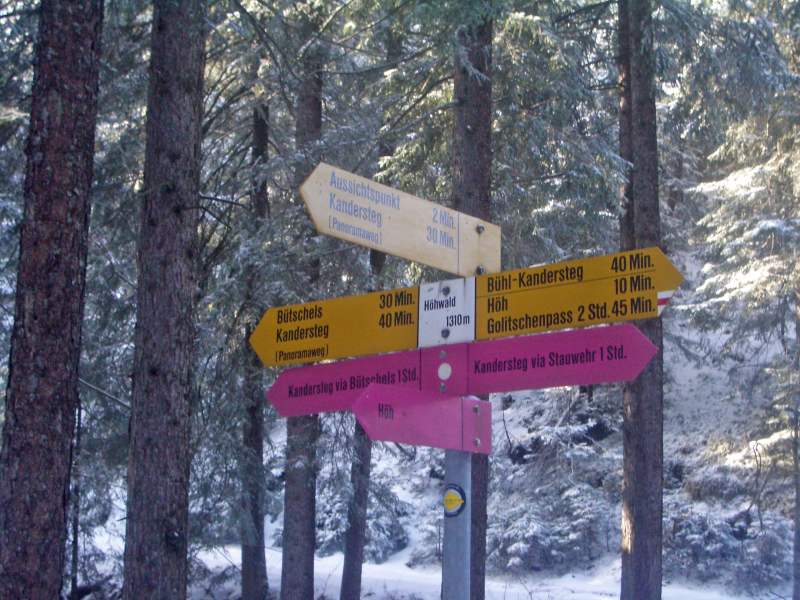 Zurück beim Wegweiser Höhwald, folgen wir dem breiten Waldweg nach rechts. Interessantes Gelände, früheres Bergsturzgebiet, im Sommer Ausgangspunkt zum "Golitschenpass". Der etwas holprige Weg senkt sich gemächlich durch den Wald und führt in einem grossen Bogen zum Waldrand hinunter. Hier gehen wir links Richtung "Blausee". Das kurze Strassenstück (ca. 100m), auf dem wir zum Stauwehr hinuntergelangen, ist glitschig (Schuhkrallen wären nützlich). Unten rechts vom Stauwehr unterqueren wir die Hauptstrasse und könnten in 20 Minuten dem Uferweg der Kander entlang zum Bahnhof spazieren.