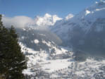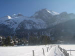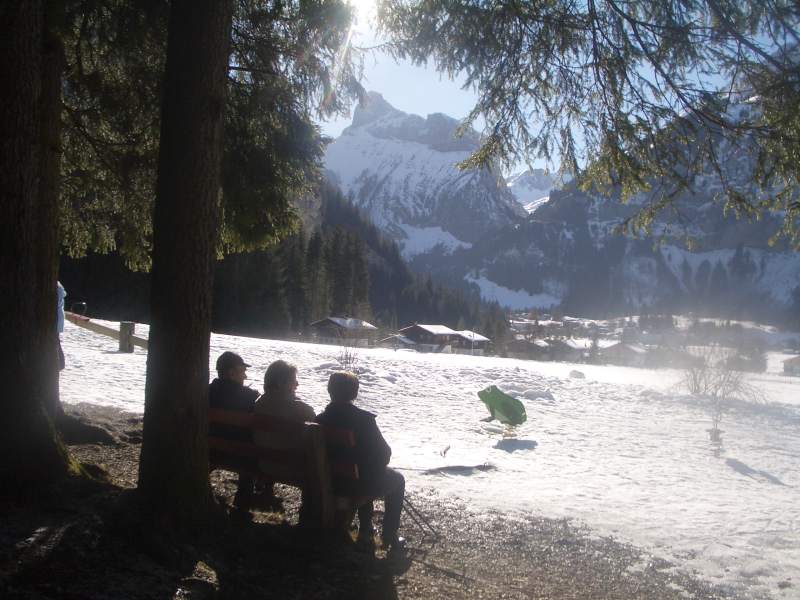 Beim Spielplatz, wo wir aus dem Wald treten, ändert sich die Szenerie: Am der sonnigen Hang kreuzen sich Loipen und Wege, die Ruhebänke laden zu einer Pause ein. Nach "Kandersteg" sind zwei gleich lange Wege angegeben - wir nehmen den linken, der zweimal die Loipe kreuzt, am Friedhof vorbei führt und auf die Hauptstrasse trifft. Nach rechts; Rechter Hand locken Läden und Restaurants zum Verweilen. Gegenüber der Kirche gehts durch die Bahnhofstrasse zum Bahnhof Kandersteg zurück.