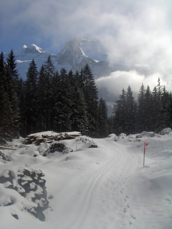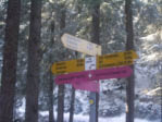 Der lila Winterwegweiser beim Bahnhof Kandersteg führt uns dem Eisbahnweg entlang Richtung "Gemmipass". 10 Minuten später gehen wir durch die Bahnunterführung, dann 50m nach rechts und aufwärts Richtung Wald. Das steile Strässchen mündet beim obersten Holzhaus in den Loipenweg und führt ebenaus in den Höhwald hinein. Über Nacht hat es zum Glück geschneit, die vorher vereisten Wege sind griffig und weich. Noch sind sie nicht gespurt - gemäss Infotafel haben die Wege und Loipen im Tal Priorität.